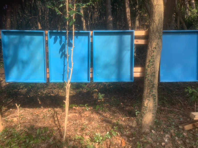 森の入り口の看板を 制作しています。青色の下地の上に 小鳥の写真を貼ります。