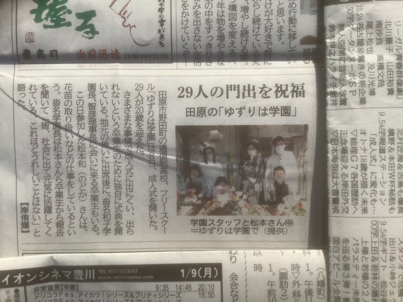 29人の門出を祝福 〜 東愛知新聞のタイトルで 掲載 1月9日 (月)