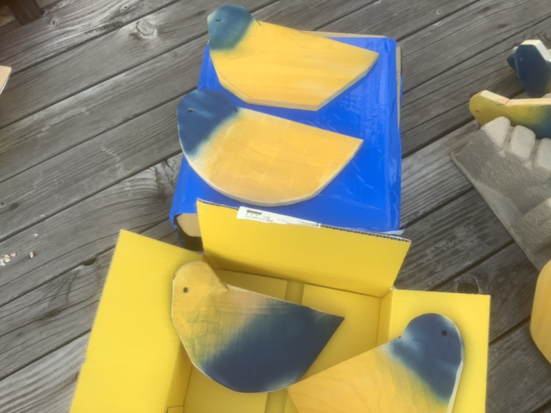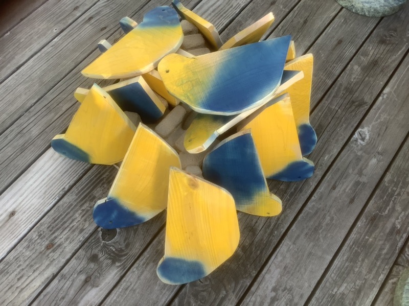 森にウクライナ🇺🇦の 国旗の色の小鳥を飾ります。ウクライナの青い空と麦畑の黄色大地に 安全な平和が 訪れることを祈ります。