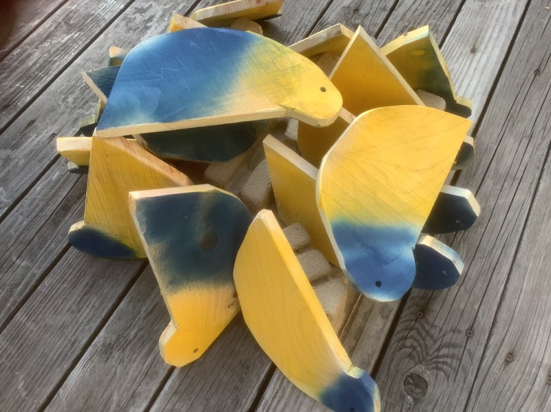 森にウクライナ🇺🇦の 国旗の色の小鳥を飾ります。ウクライナの青い空と麦畑の黄色大地に 安全な平和が 訪れることを祈ります。