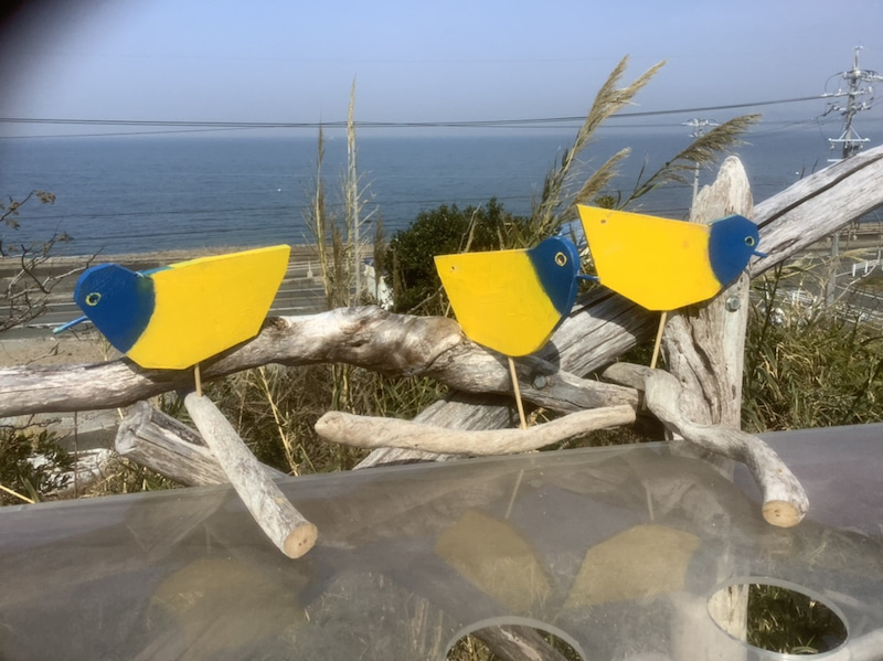 今日は ウクライナ色の鳥を森の木に 止まらせました。流木の木に 止まらせ それぞれ鳥🦉に