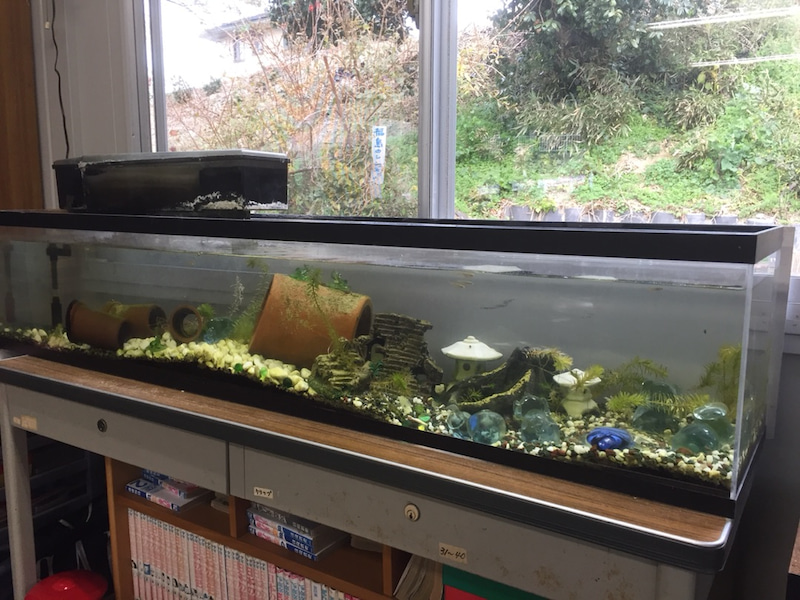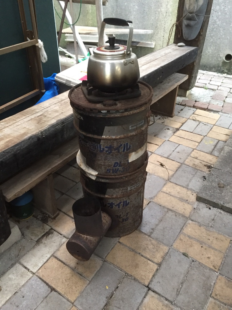 教室のメダカの水槽と小屋の中のハソリ釜です。ロケットストーブはお茶を飲む時 少しの料理を作るなら便利です。