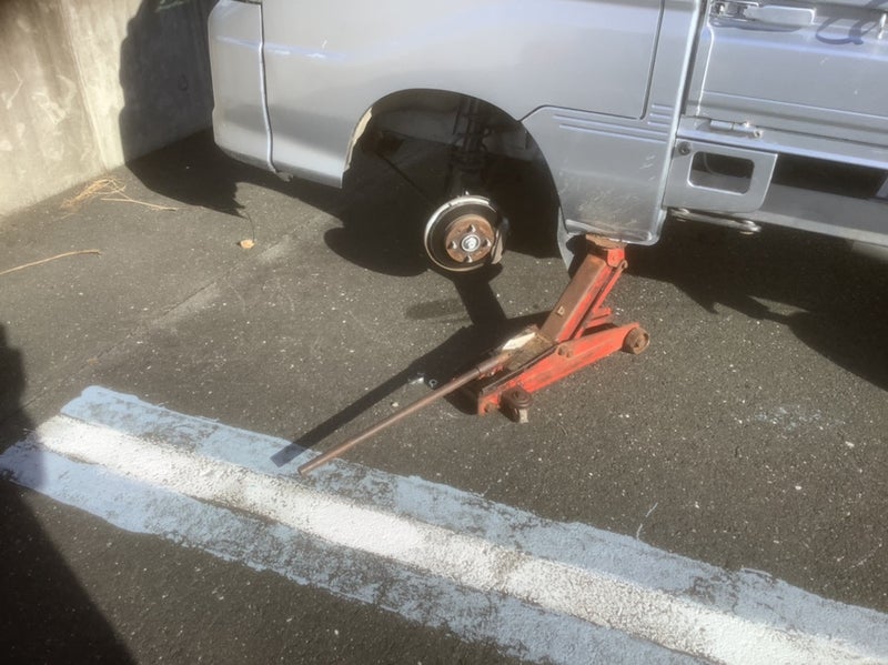 海の貨物船のネオンを見ていると 駐車場の軽トラの左前がパンクしていました。