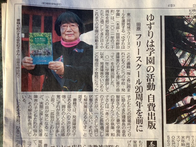20年間をまとめた本。「海と森に囲まれた もうひとつの学校」〜発達障害の子ども達にも寄り添って〜を中日新聞朝刊に紹介されました。①潮風の電話 ②発達障害 ③いじめ・不登校・ひきこもり ④家族問題と向き合って ⑤教育現場に想う ⑥海と森に囲まれた もうひとつの学校・もうひとつの家族  \6章でまとめてあります。