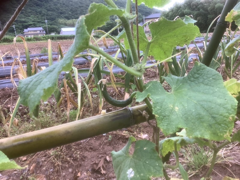 朝7時 農園の水やりを いつも通り見ていたら キュウリ ナスに小さな実が実っていました