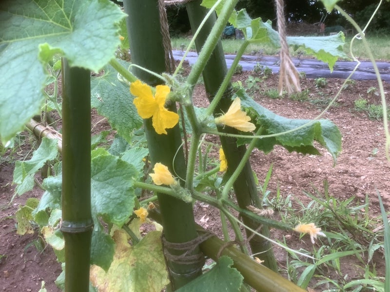 朝7時 農園の水やりを いつも通り見ていたら キュウリ ナスに小さな実が実っていました