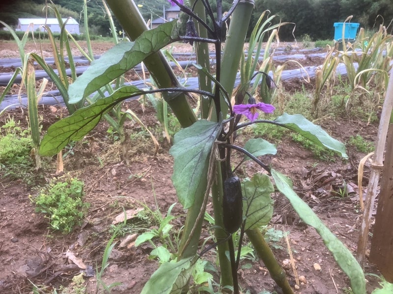 朝7時 農園の水やりを いつも通り見ていたら キュウリ ナスに小さな実が実っていました