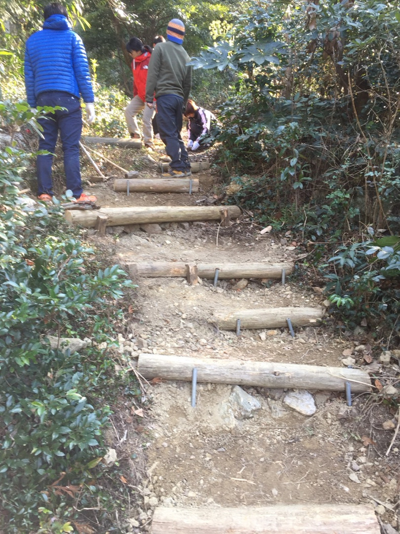 山道作りをしました。丸太の階段作り 石を使って 土を被せて 歩きやすくしました。