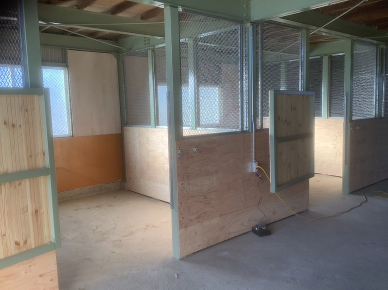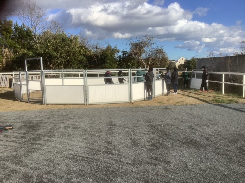 野依は牛舎のあとです。広い馬のグランドもできます。グランドの中に馬狭いスペース🐎やヤギの🐐スペースの柵を組み立てました。